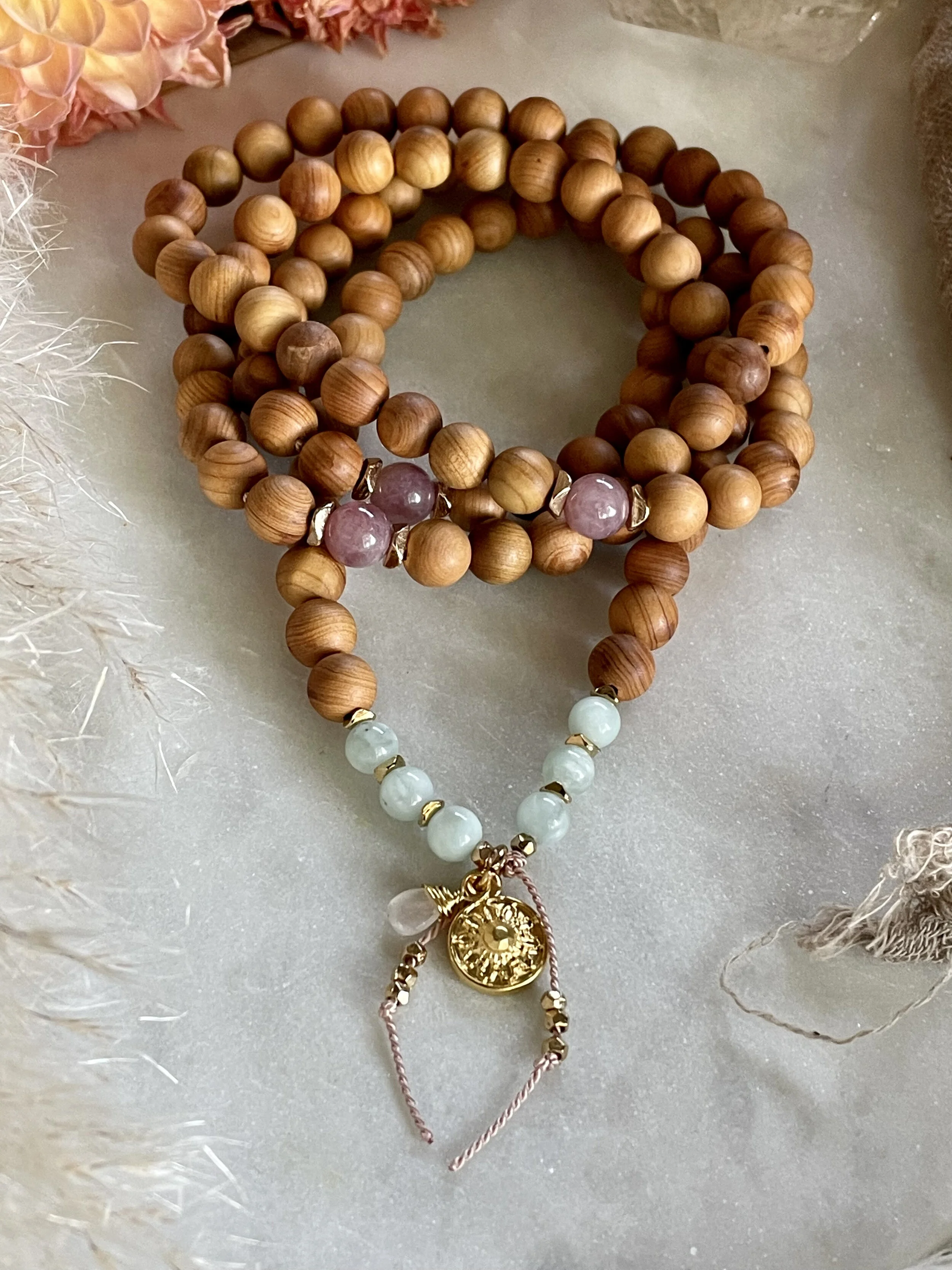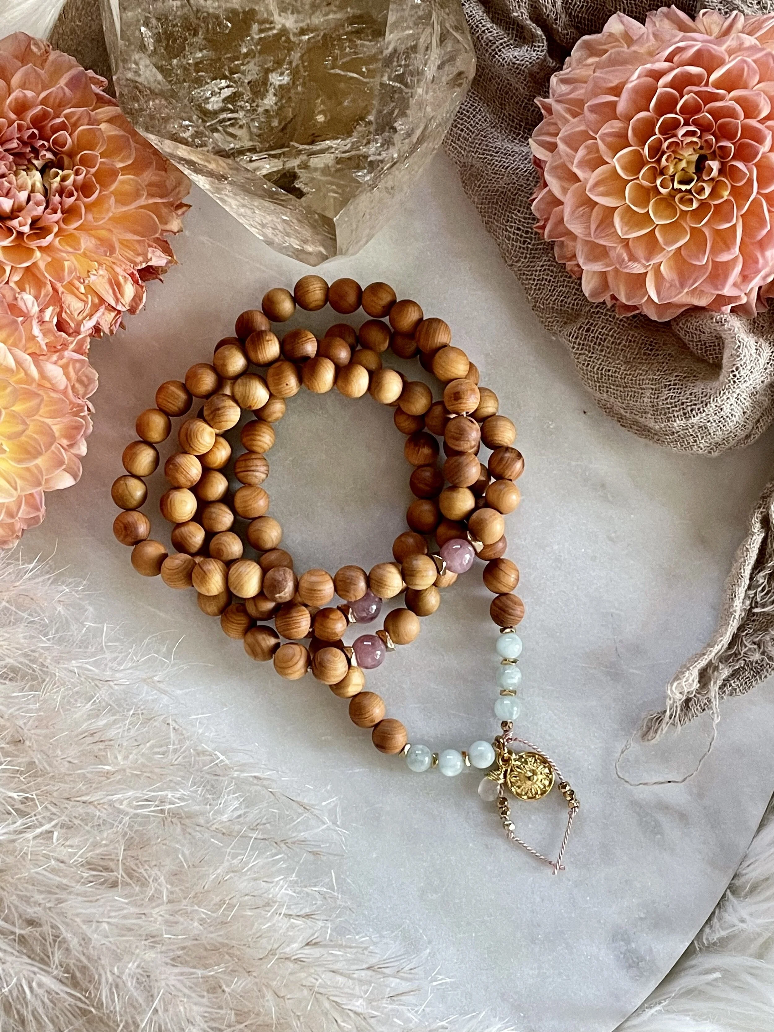 Hand knotted on durable silk cord, accented with gold plated findings and infused with Reiki healing Light.